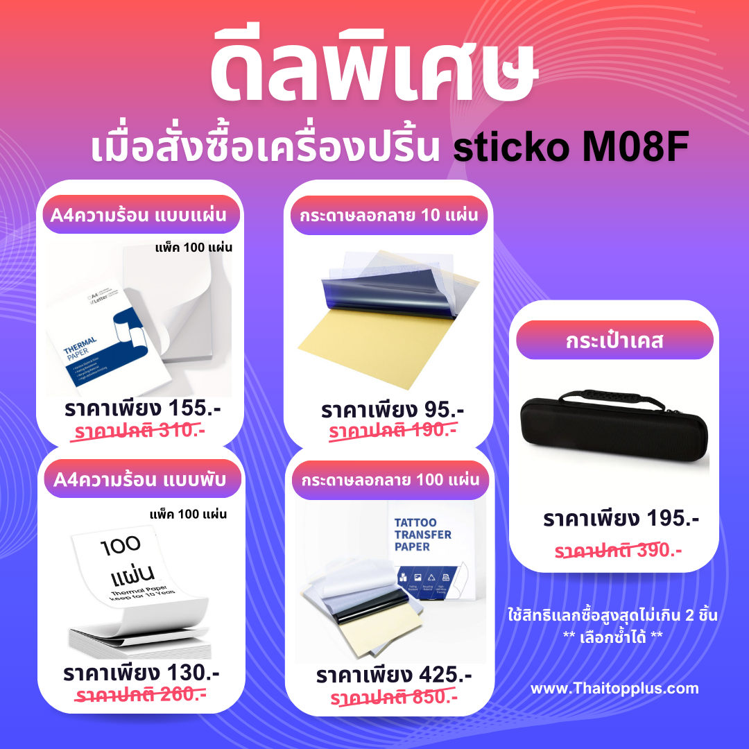 sticko M08F เครื่องปริ้นความร้อน A4 แบบพกพา ไร้สาย ไม่ต้องเติมหมึก A4 Mini Printer